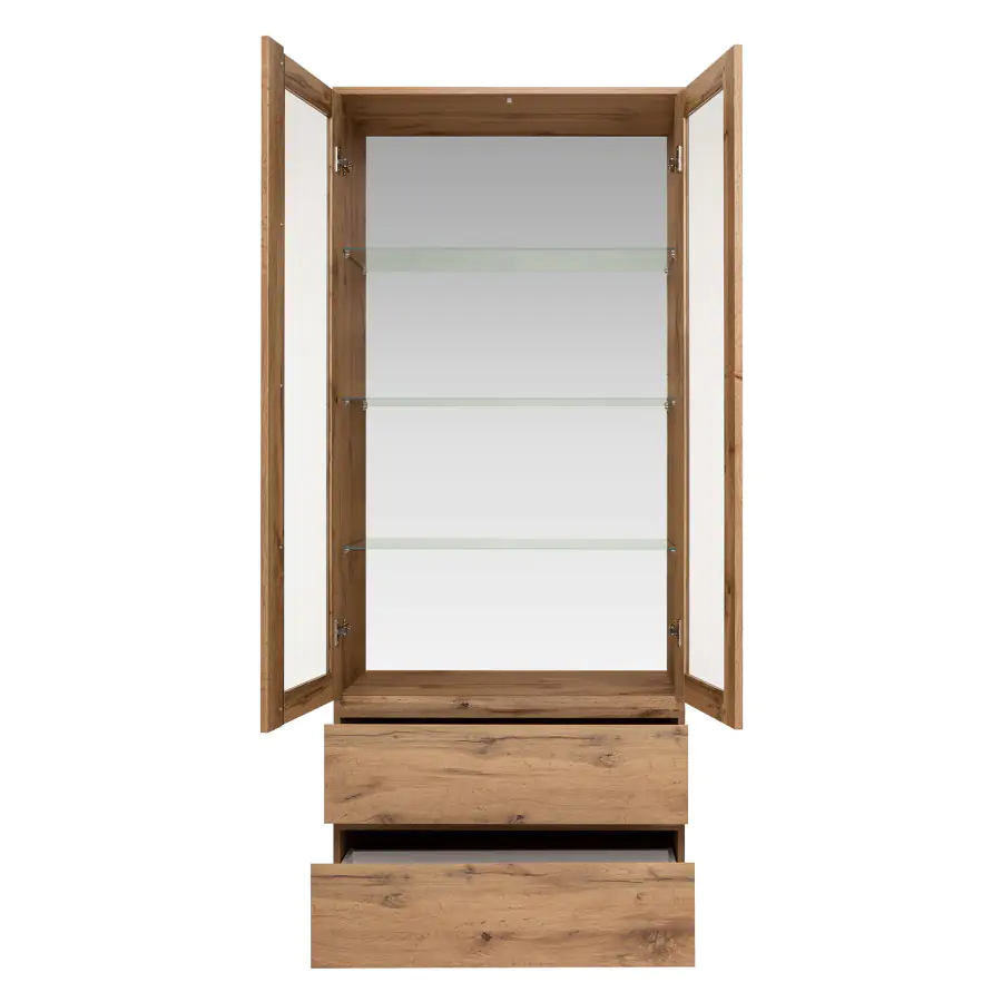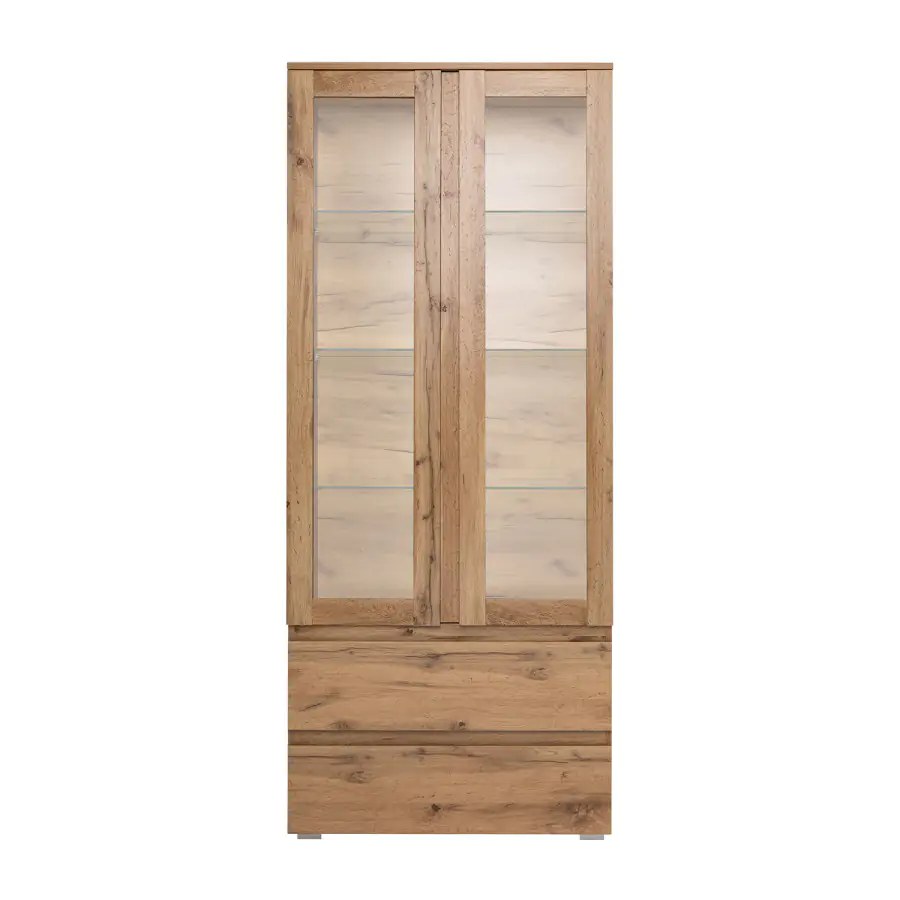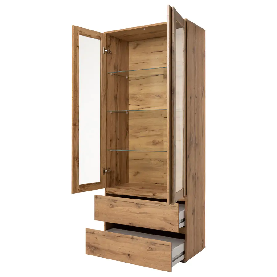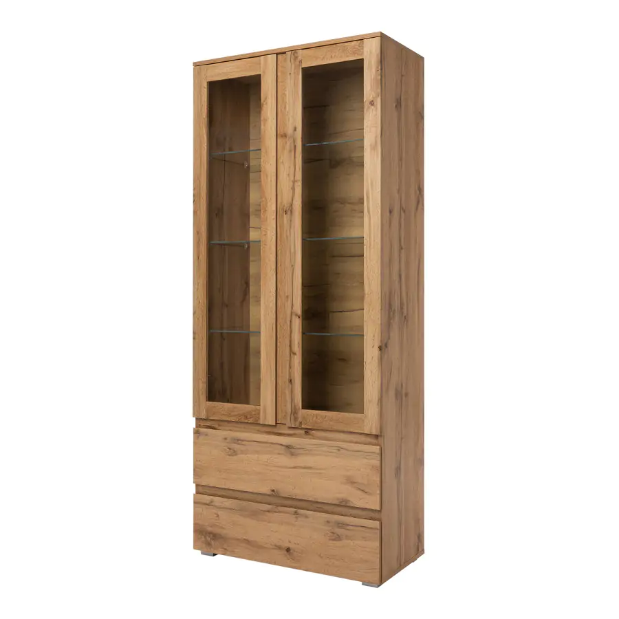 Vitrína barevném provedení zlatý dub má dvoje prosklené dveře, za kterými se nacházejí tři skleněné police.