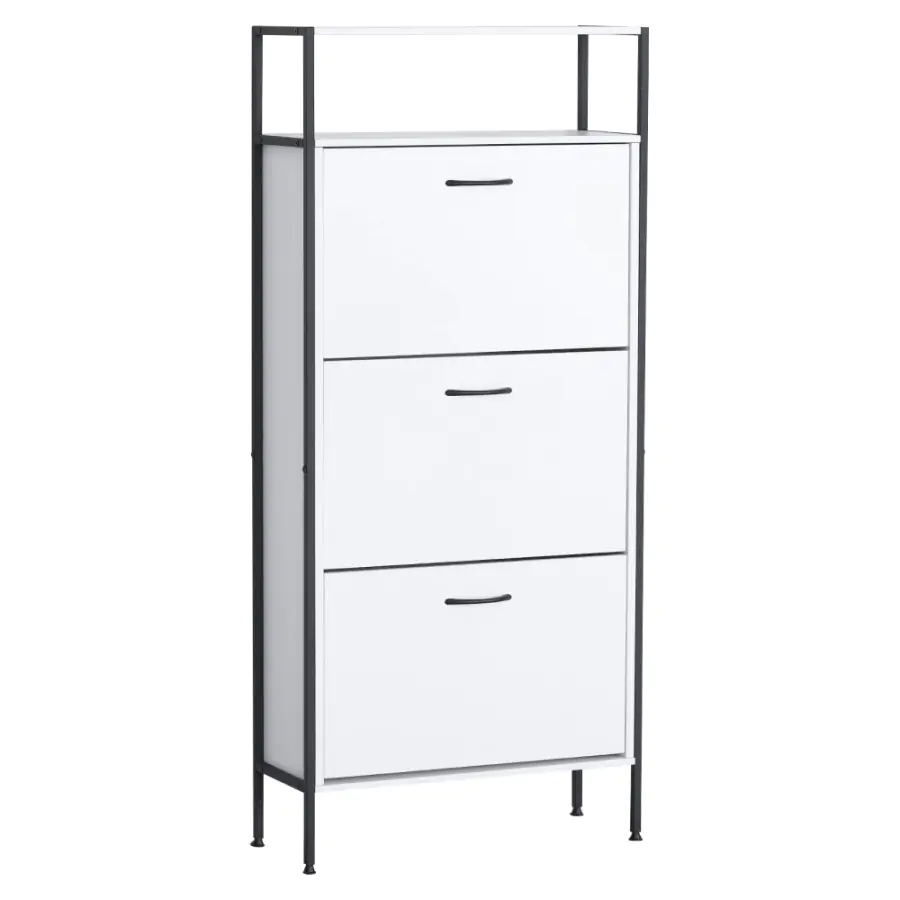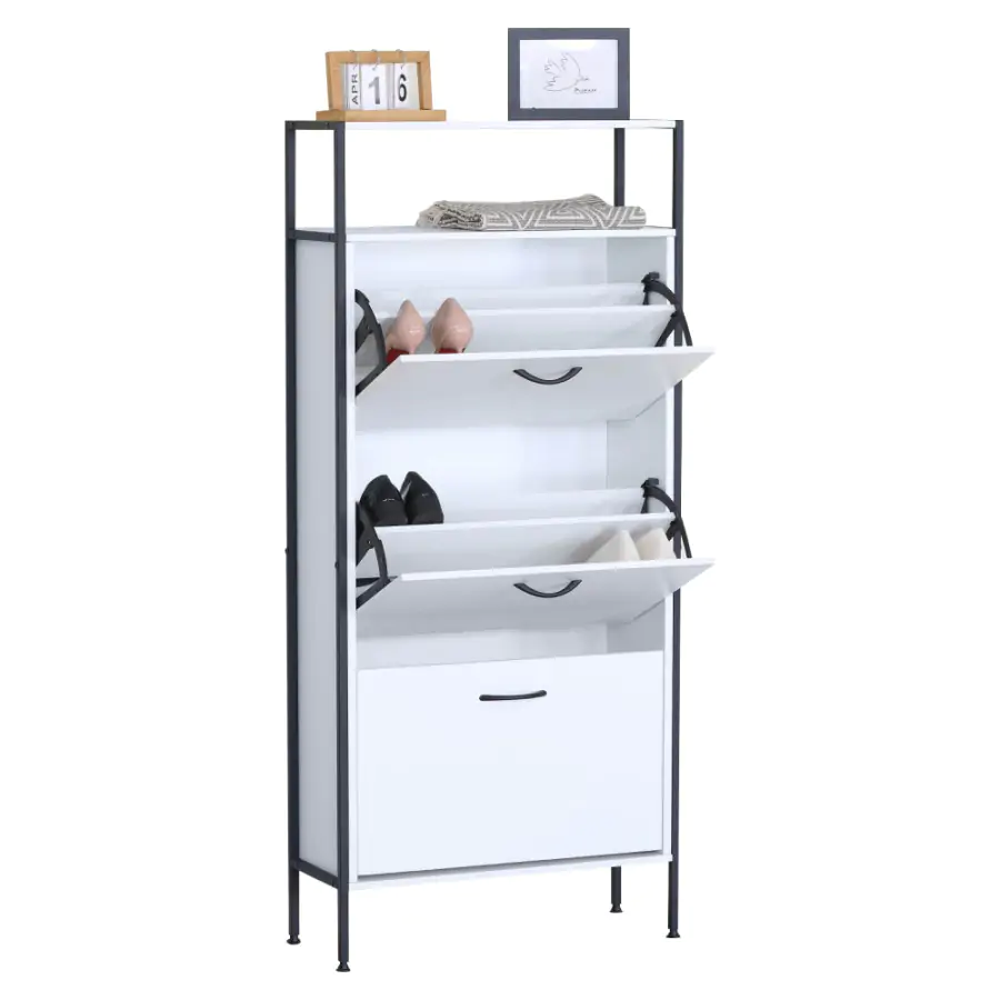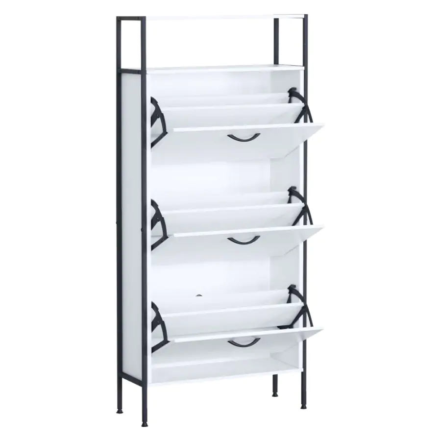 Jeho minimalistický vzhled v bílé barvě s černými detaily se dokonale hodí do moderních interiérů. Výklopný mechanismus usnadňuje přístup k obuvi a pomáhá udržovat předsíň uklizenou.