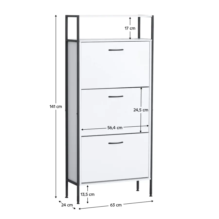 Vneste do své předsíně pořádek a styl s praktickým a elegantním třípatrovým botníkem TREDIS. Má tři výklopné šuplíky, přičemž každá obsahuje dvě přihrádky, které poskytují dostatek místa pro boty od elegantních podpatků až po každodenní tenisky. Botník je vyroben z kombinace dřevotřísky a ocelové konstrukce a doplněn o plastové úchytky.