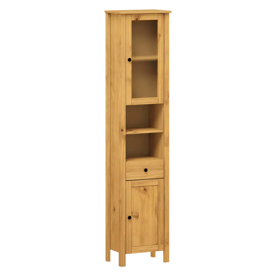 Kombinovaná vysoká skříňka PORTO v rustikálním stylu doplní interiér koupelny a zajistí dostatek úložného prostoru. Disponuje prosklenou a plnou částí s poličkami, 1 šuplíkem s kovovými pojezdy a otevřeným odkládacím prostorem.