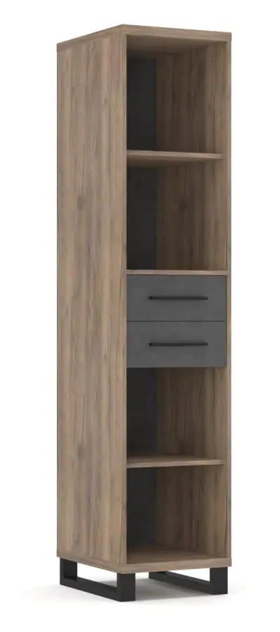 Policový regál ROSOLINI se dvěma zásuvkami v industriálním stylu je vyroben z kvalitní LTD v barevném provedení dub tabaco/matera. Pevné kovové nohy podtrhují loftový ráz nábytku. Úchyty jsou kovové....
