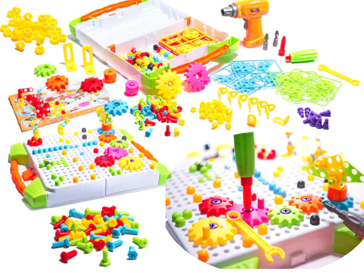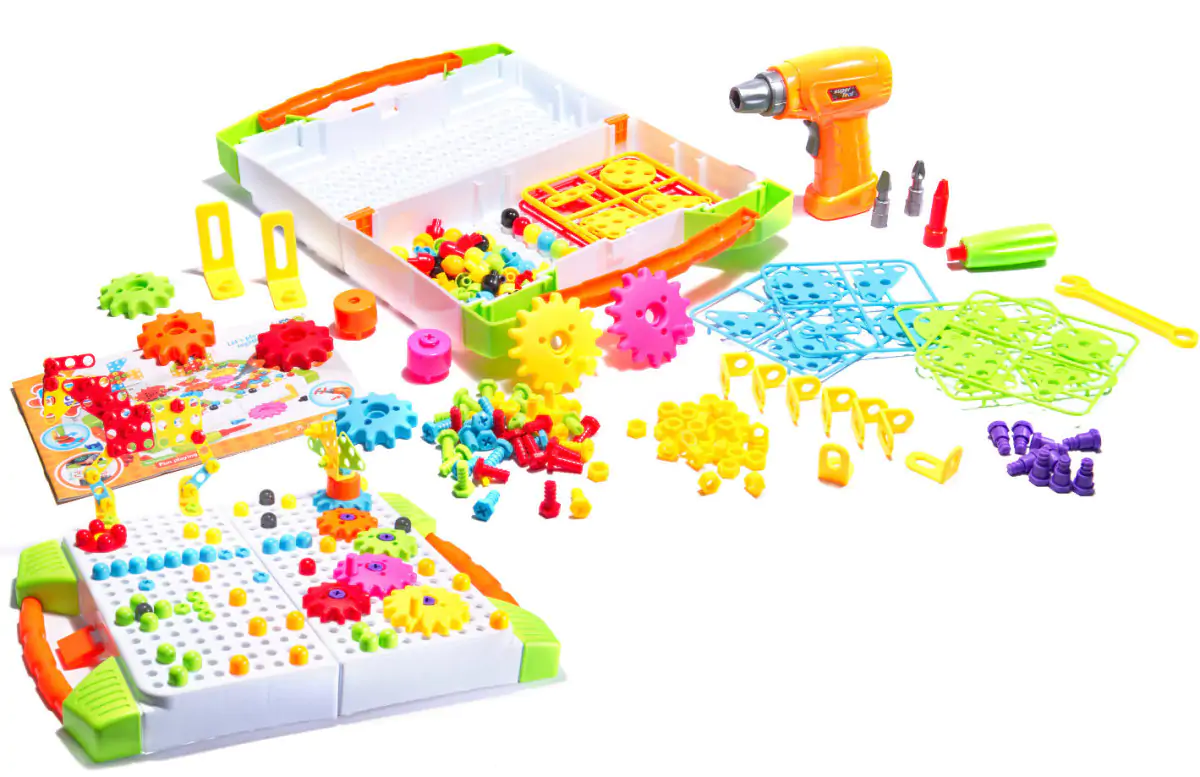Vzdělávací sada vrtačky a vrtáku pro malého kutila v přenosném kufříku. Hra spočívá v zašroubování barevných šroubku do desky pomocí vrtačky nebo vrtáku. Sada nabízí vytvoření nekonečného množství 2D postaviček a tvaru. Vaše dítě se zabaví na dlouhé hodiny připevňováním matek, šroubů a šablon k desce pomocí akumulátorové vrtačky nebo šroubováku. Sada rozvíjí kreativitu, matematické a logické myšlení. Sada obsahuje 181 dílu.