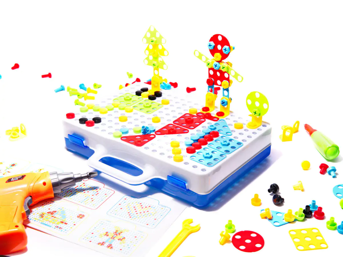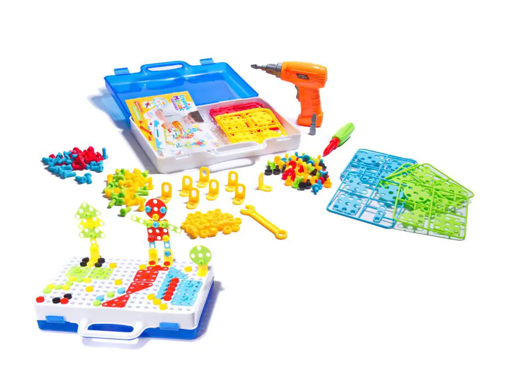 Vzdělávací sada vrtačky a vrtáku pro malého kutila v přenosném kufříku. Hra spočívá v zašroubování barevných šroubku do desky pomocí vrtačky nebo vrtáku. Sada nabízí vytvoření nekonečného množství 2D postaviček a tvaru. Vaše dítě se zabaví na dlouhé hodiny připevňováním matek, šroubů a šablon k desce pomocí akumulátorové vrtačky nebo šroubováku. Sada rozvíjí kreativitu, matematické a logické myšlení. Sada obsahuje 237 dílu.