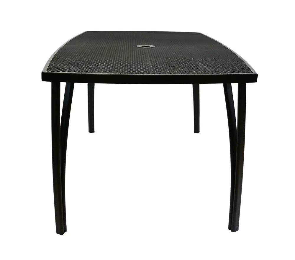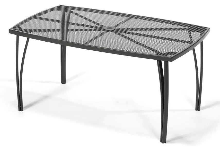 Celokovový obdélníkový zahradní stůl s drátěnou stolovou deskou je ošetřený černou práškovou barvou.