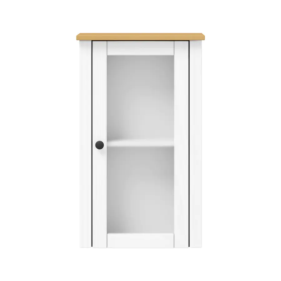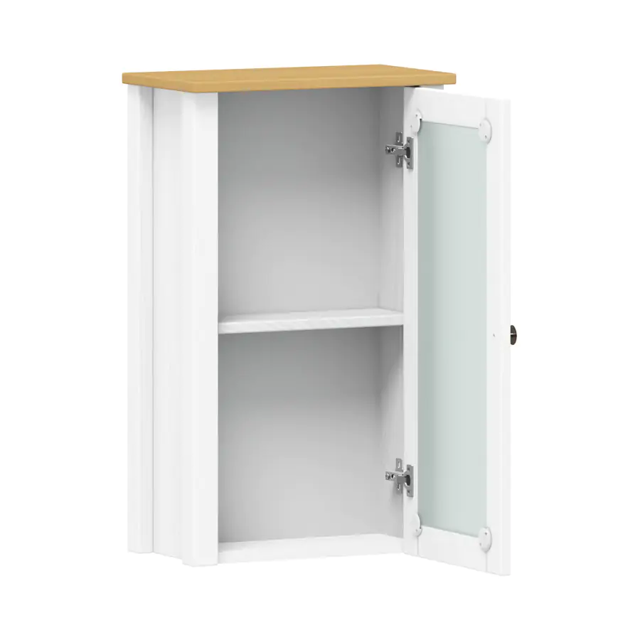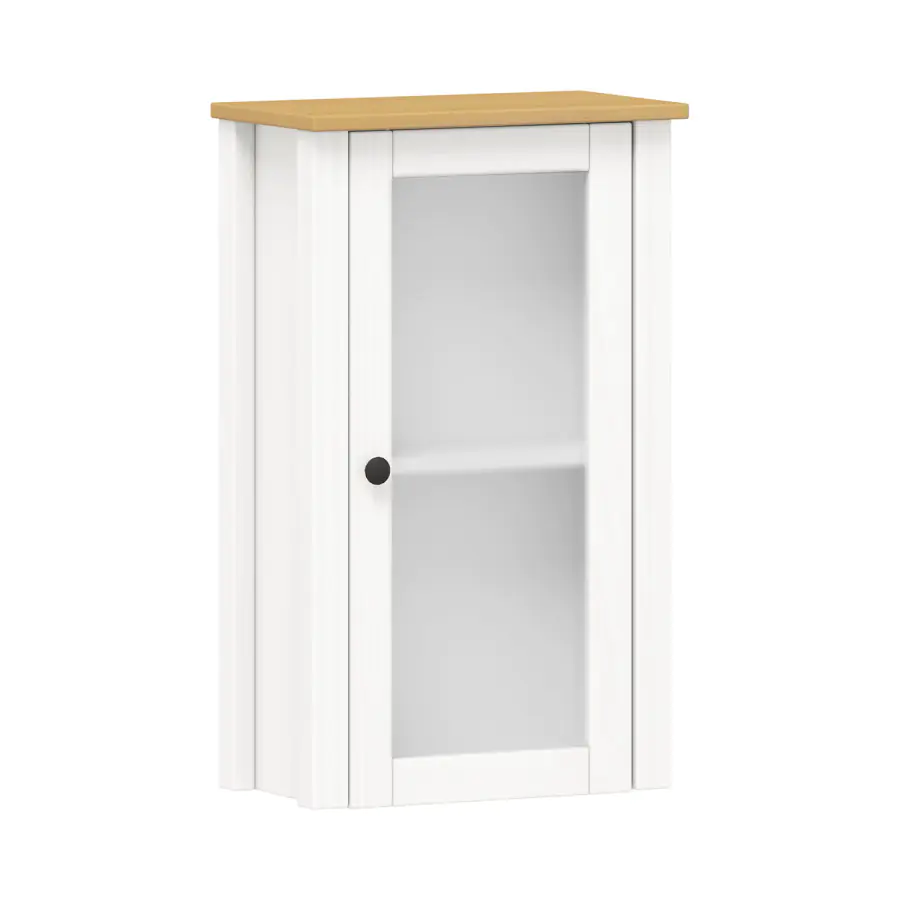 Závěsná skříňka PORTO s prosklenými dvířky v rustikálním stylu, zaplní prázdné místo na zdi koupelny. Disponuje 2 prostornými poličkami k uschování všech nezbytností, které jsou součástí ranní a večerní rutiny.