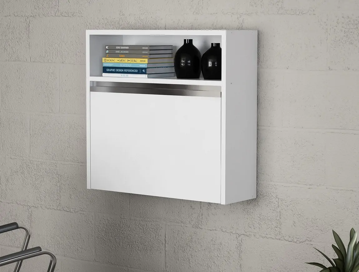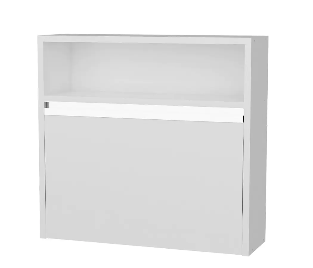 Závěsná skříňka VERDER s výklopnými dvířky je vyrobena z kvalitního lamina o tl.18 mm hraněné PVC páskou, odolného proti poškrábání v barvě matná bílá.