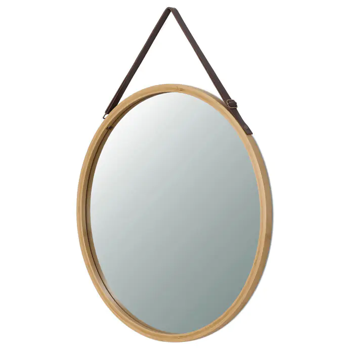 Rám z bambusu je hladce opracovaný a zvýrazňuje přirozenou kresbu dřeva, zatímco kvalitní skleněná deska zajišťuje čistý a jasný odraz. Zrcadlo je zavěšeno na tmavém koženém pásku s dřevěným úchytem, což umožňuje snadnou instalaci a zároveň přidává dekorativní prvek. Je vhodné pro umístění v předsíních, koupelnách i obývacích pokojích, kde podtrhne přírodní styl interiéru.