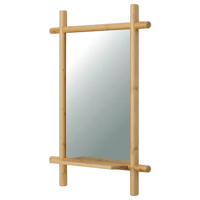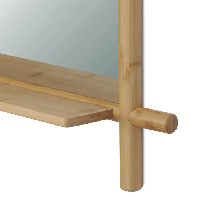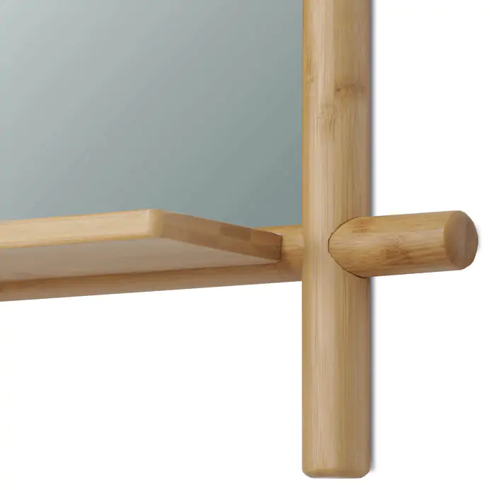 Součástí je praktická police z bambusu, vhodná pro odkládání drobných předmětů, která zvyšuje funkčnost zrcadla. Design s viditelnými kulatými bambusovými prvky působí přirozeně a zároveň moderně, což umožňuje snadné začlenění do různých interiérů.